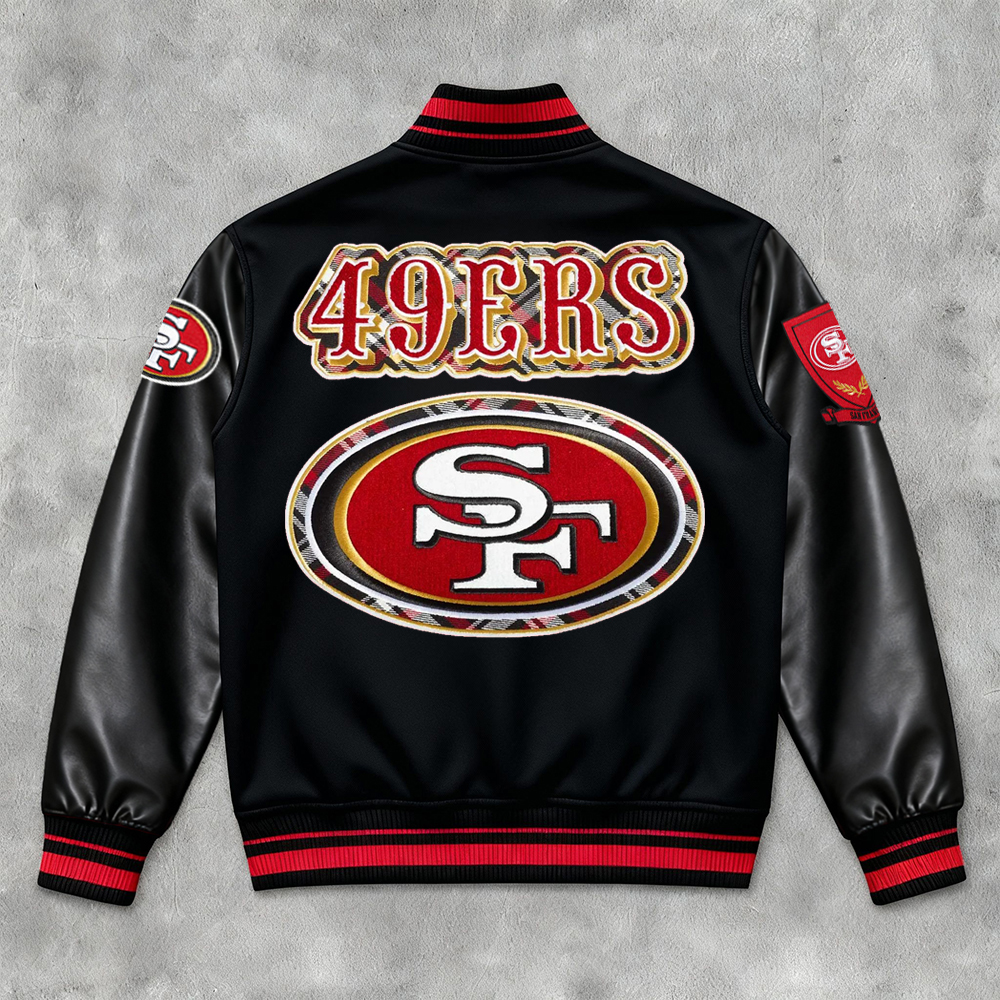 Street 49ers Print Leather Patchwork Baseball Jacket