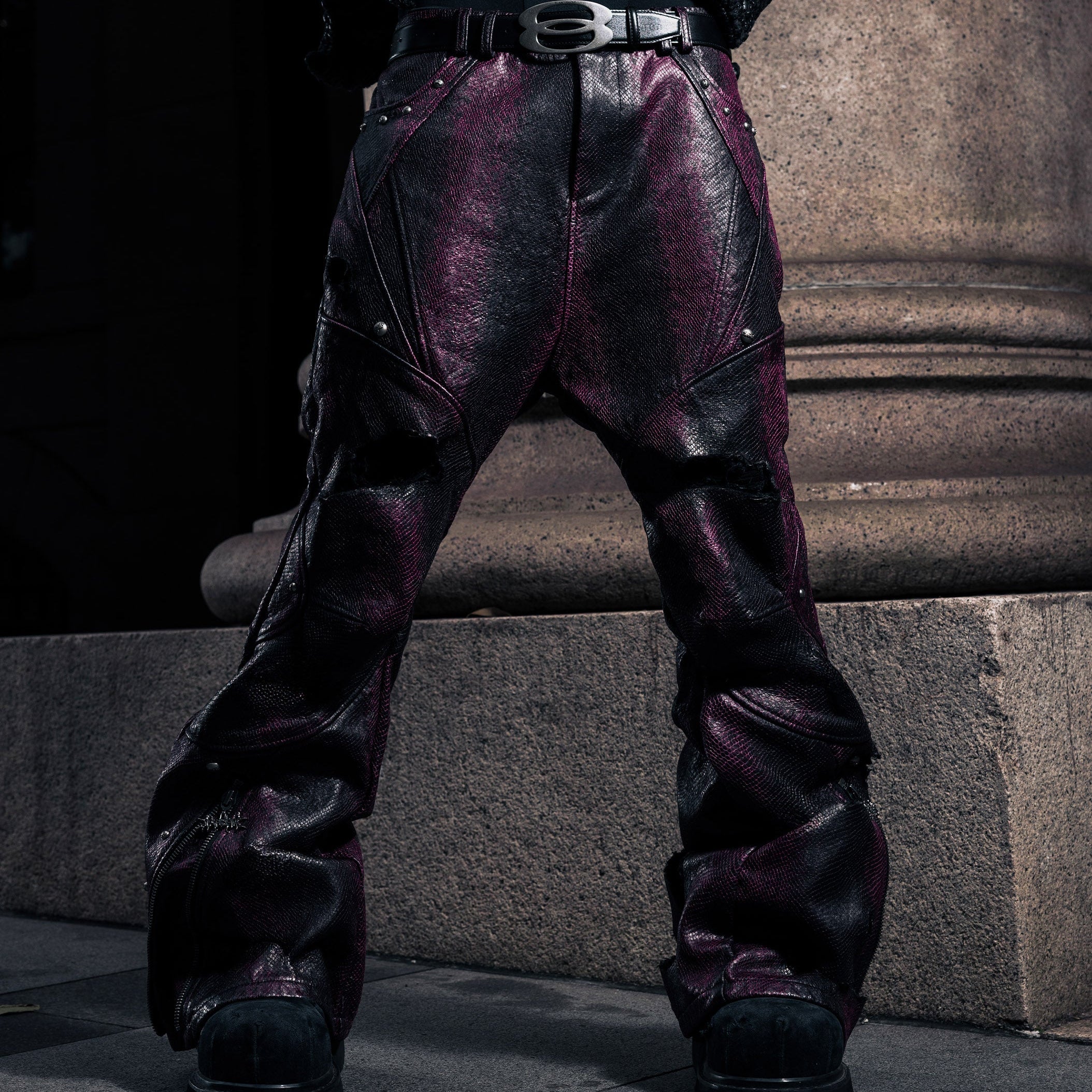 These pants feature a textured snake skin fabric, providing a luxurious feel. The innovative blend of denim craftsmanship with snake skin creates a unique distressed look. Inspired by the 1980s bohemian style, these flared pants incorporate a modern cut, making them a standout piece in any wardrobe.